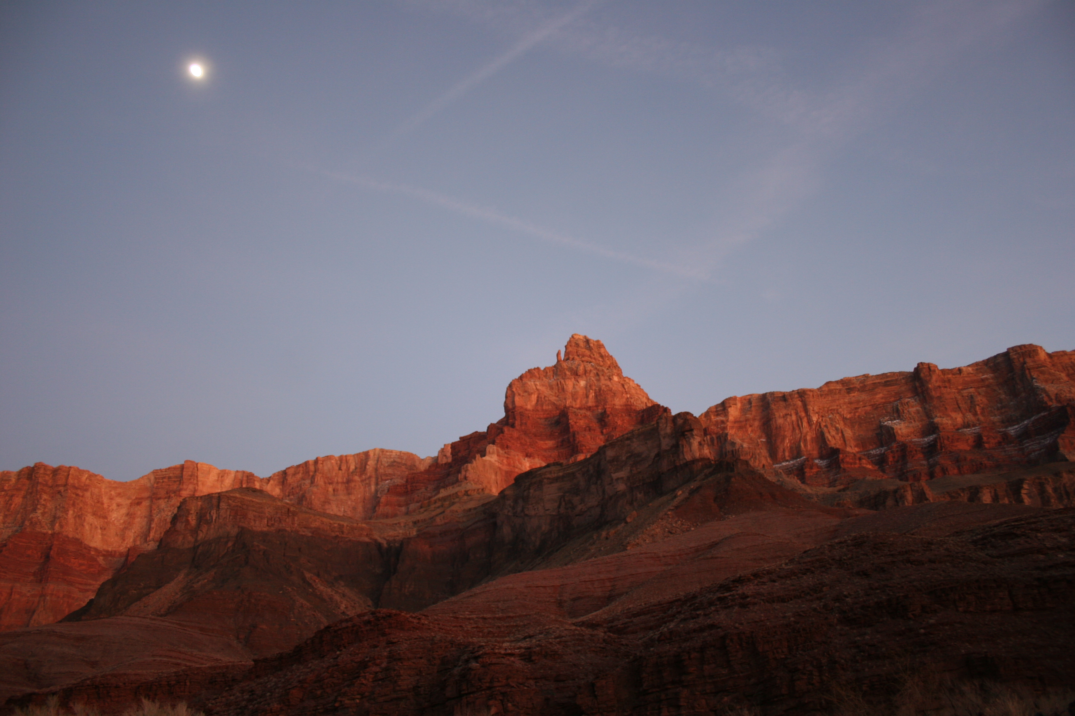 ^ Moon over the mesa - The early evening when the sun sets and the moon starts to rise is the time when the canyon really comes into its own. The light changes continually and the shifting hues of the rock colour make the hardship and work all worth it.