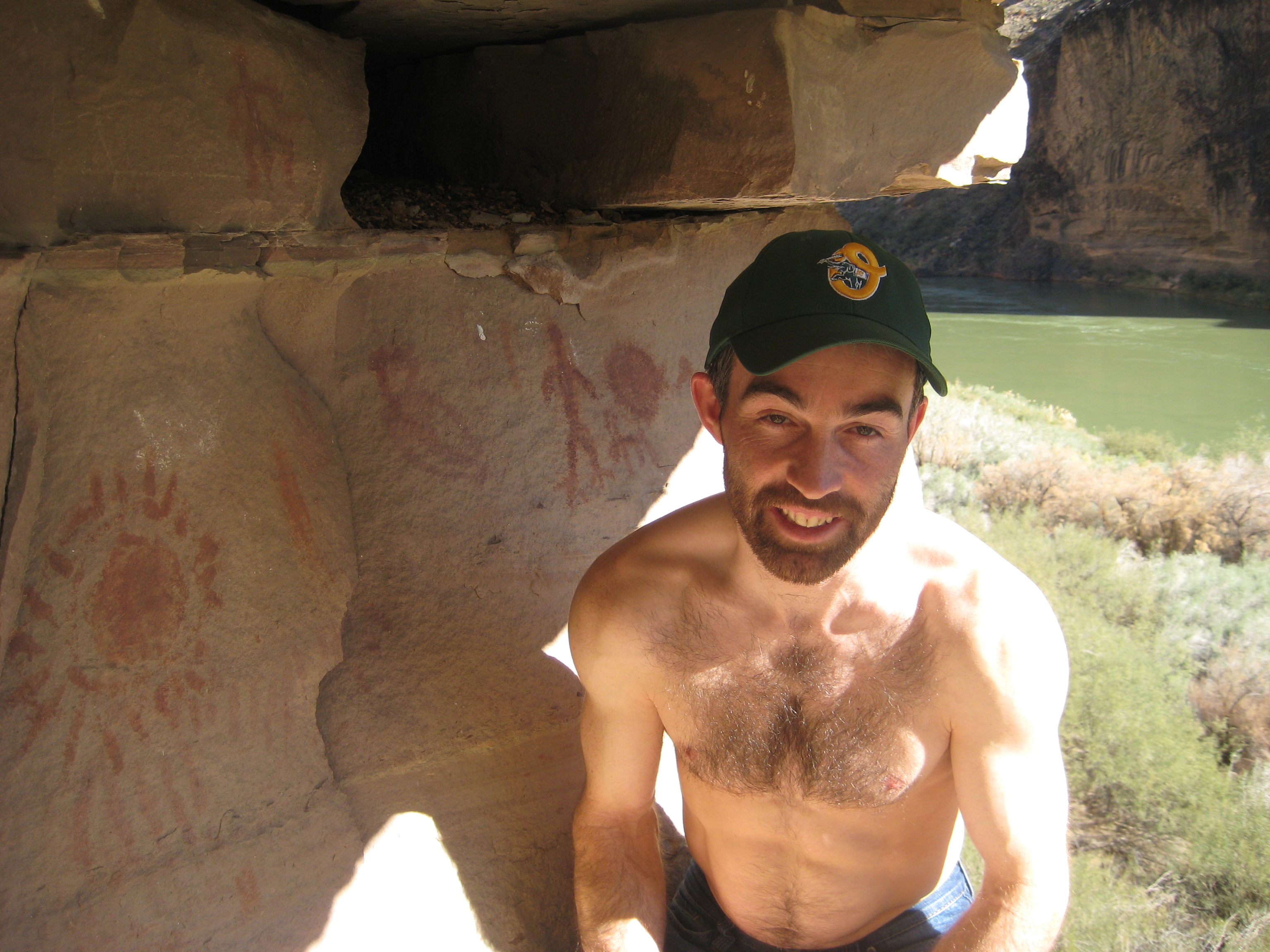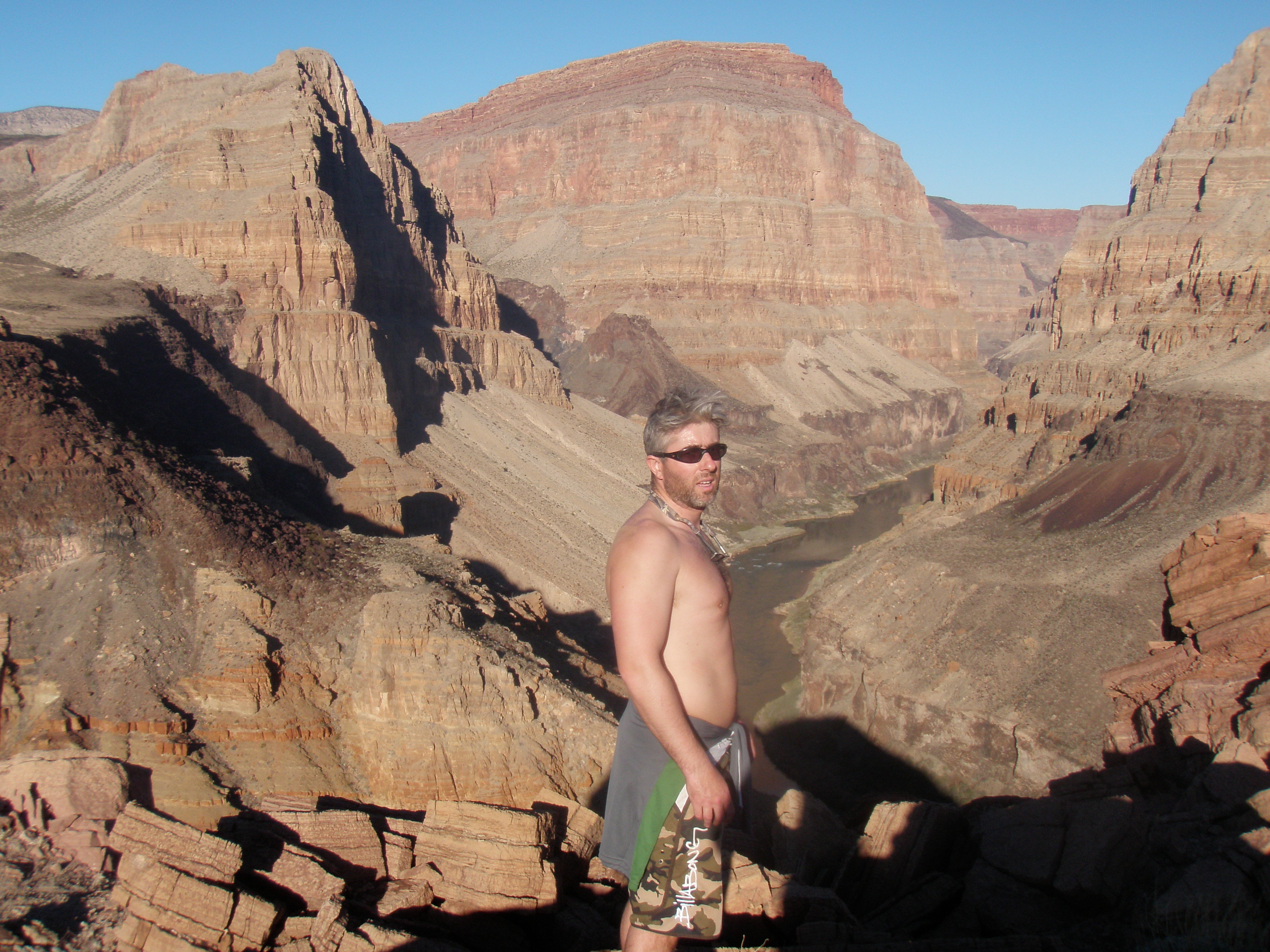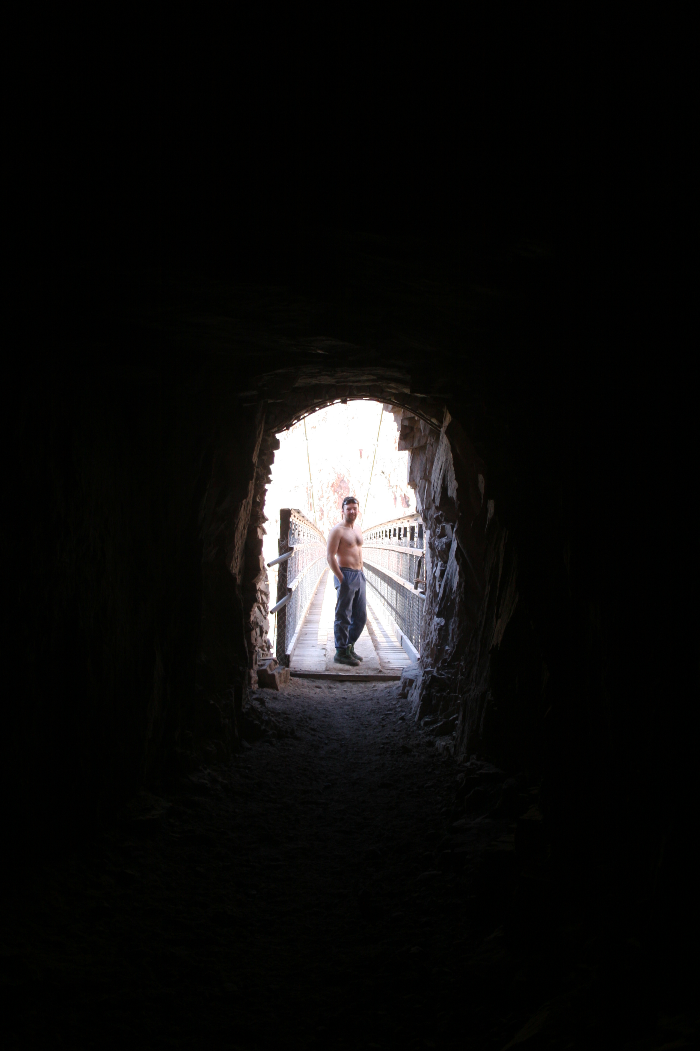 ^ Hugh poses shirtless in the tunnel to the suspension bridge at Phantom Ranch. This is the halfway point, about a week in. From here it is possible to hike out.