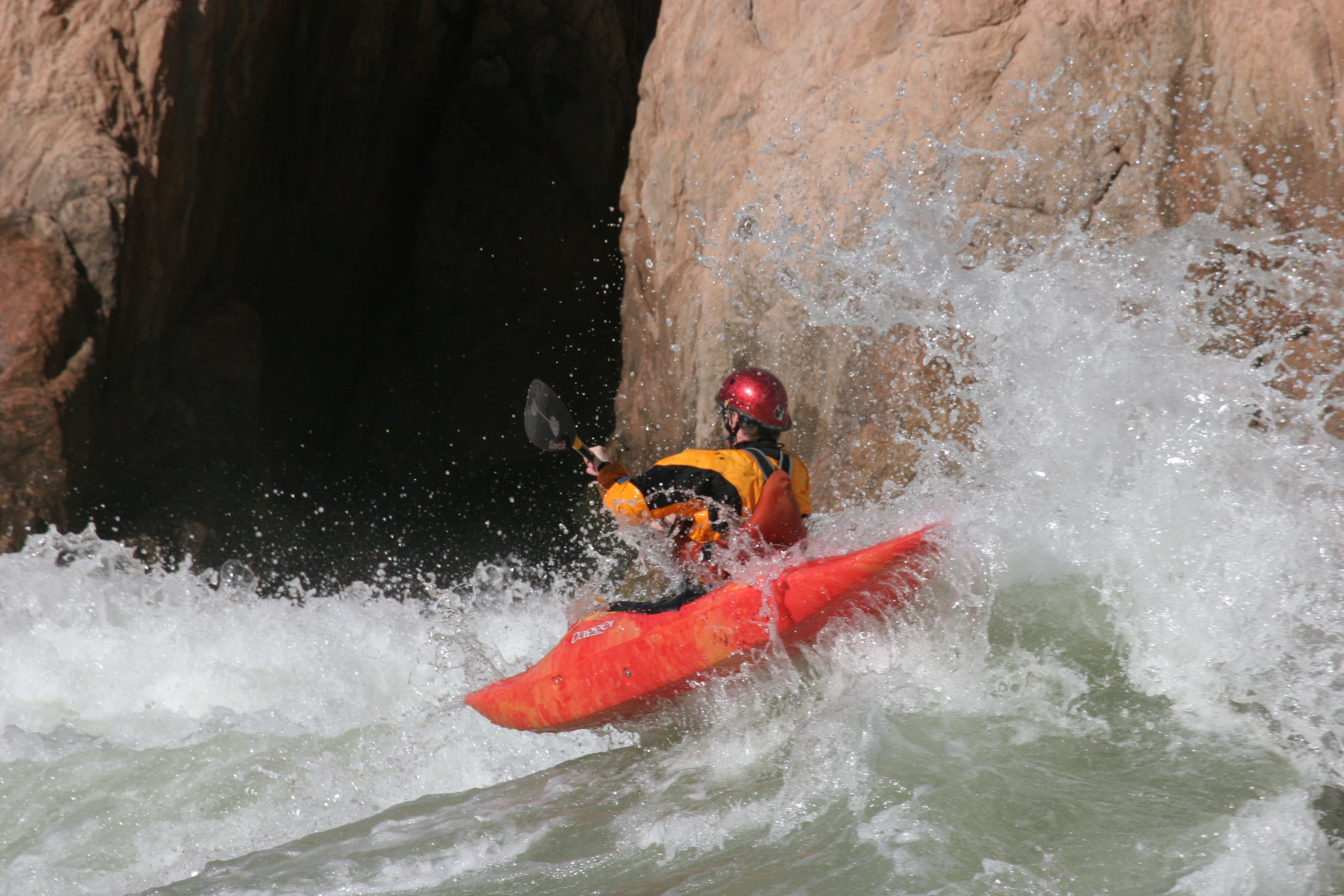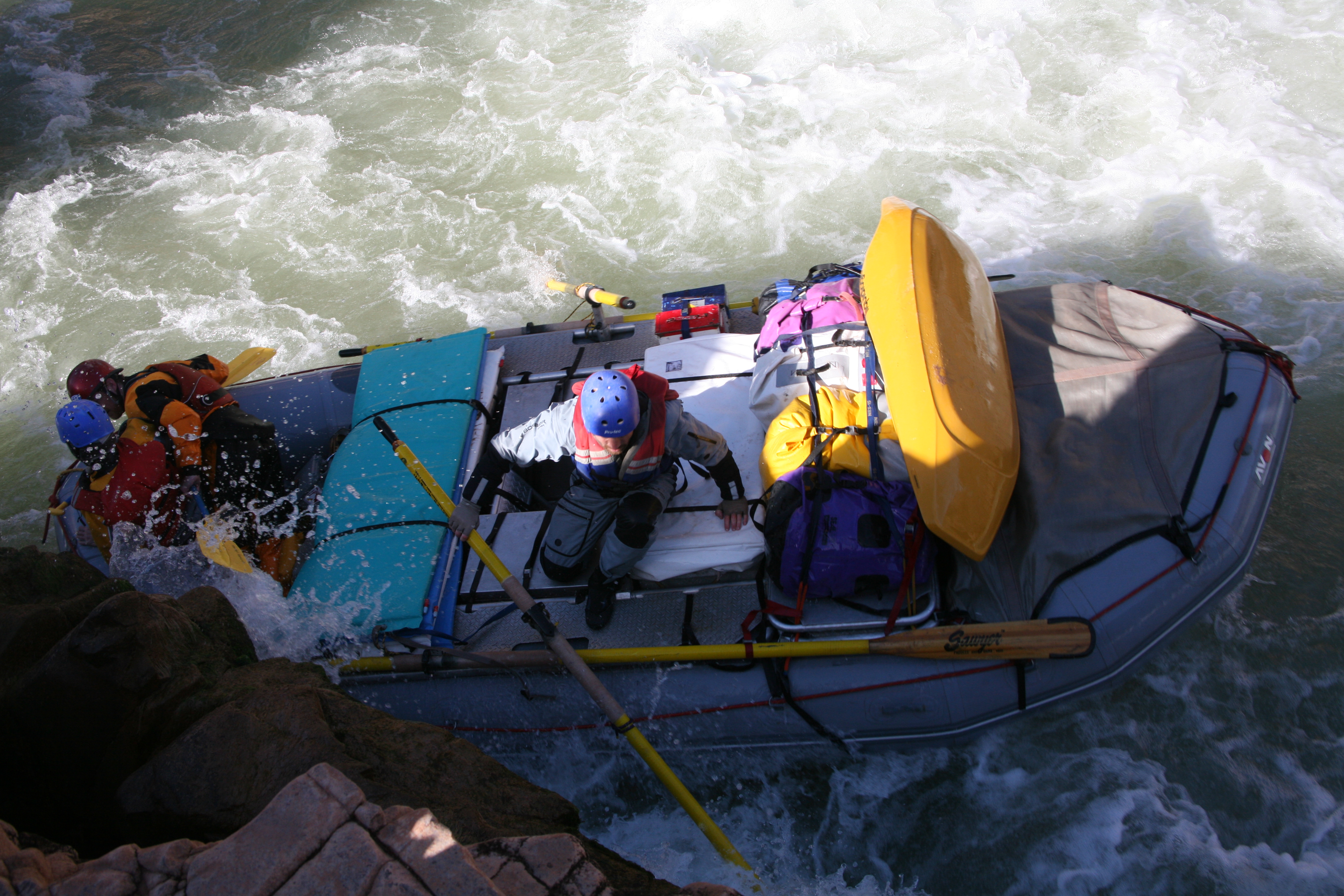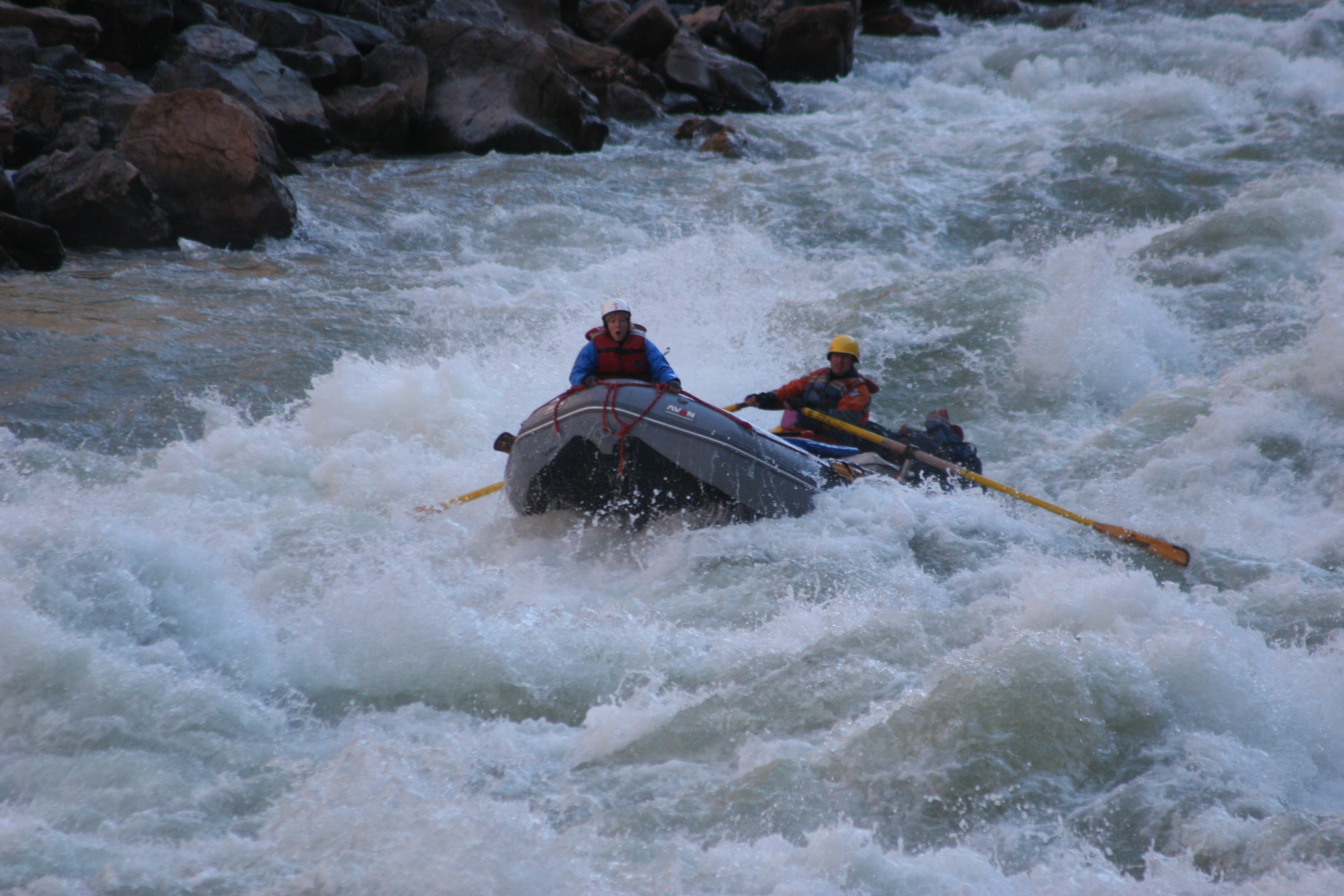 ^ Incident at Bedrock Rapid - This is Kevin, Lorna, and I unintentionally running the left channel of Bedrock Rapid, a rapid sometimes called 'Go Right Or Die.' The raft pinballed off every available rockwall and we had to scramble to keep it upright, to the amusement of all but ourselves.