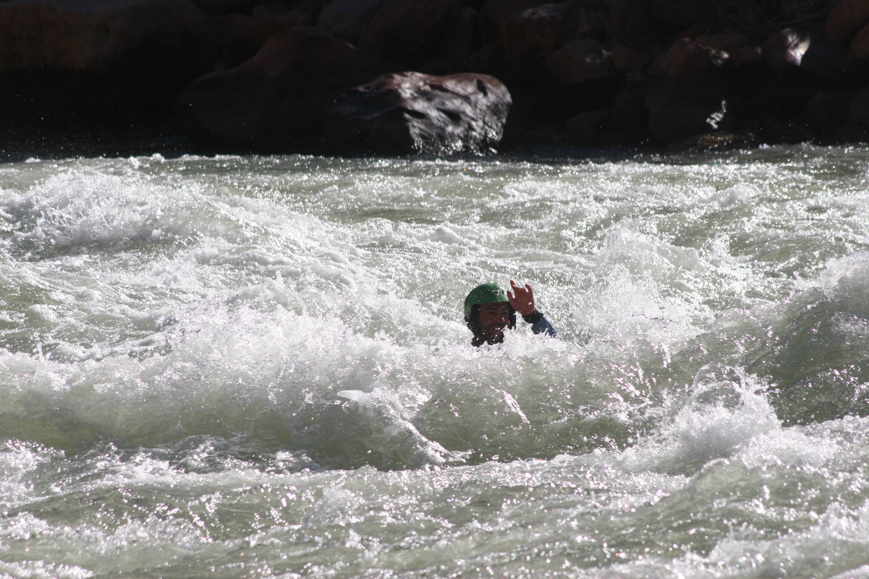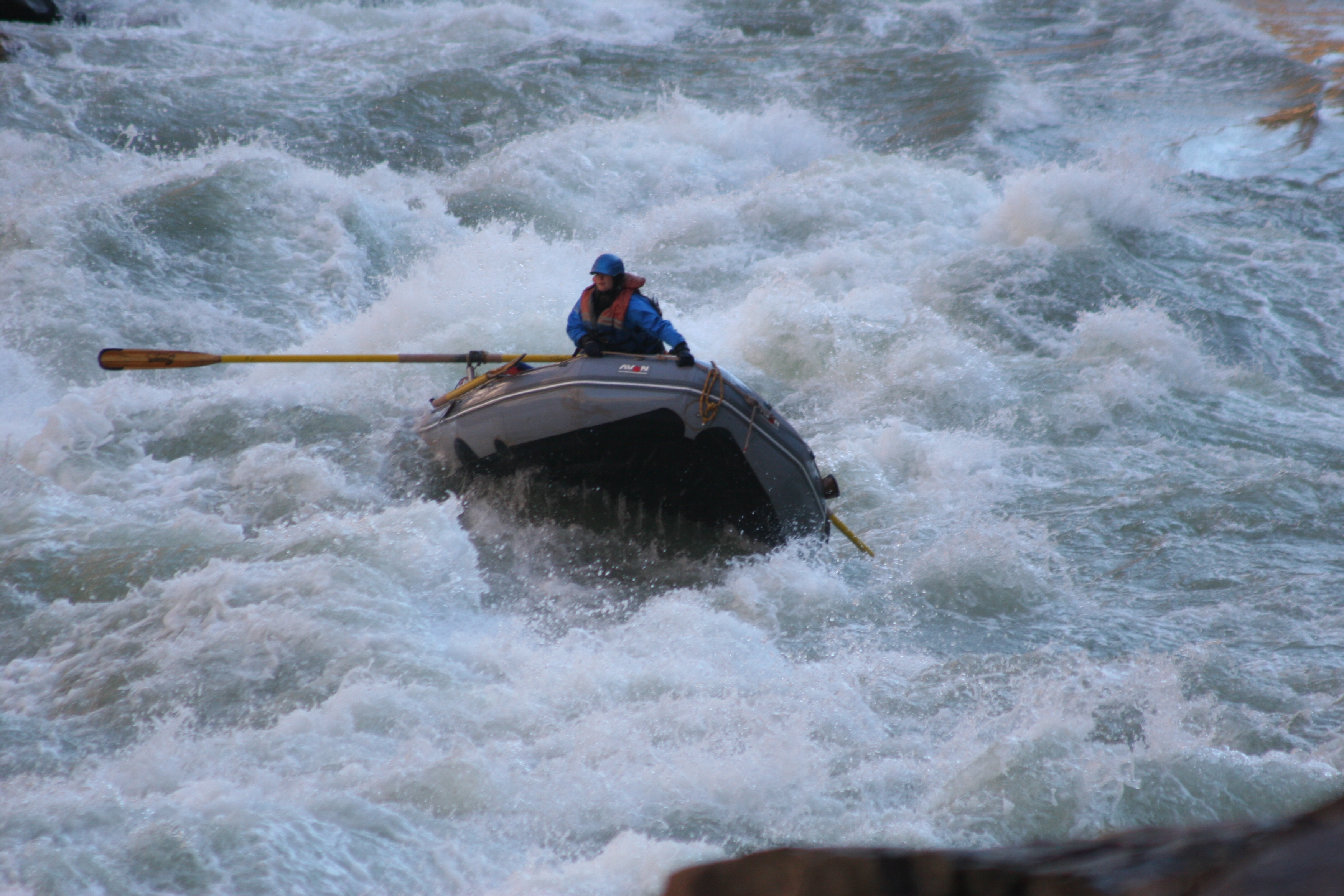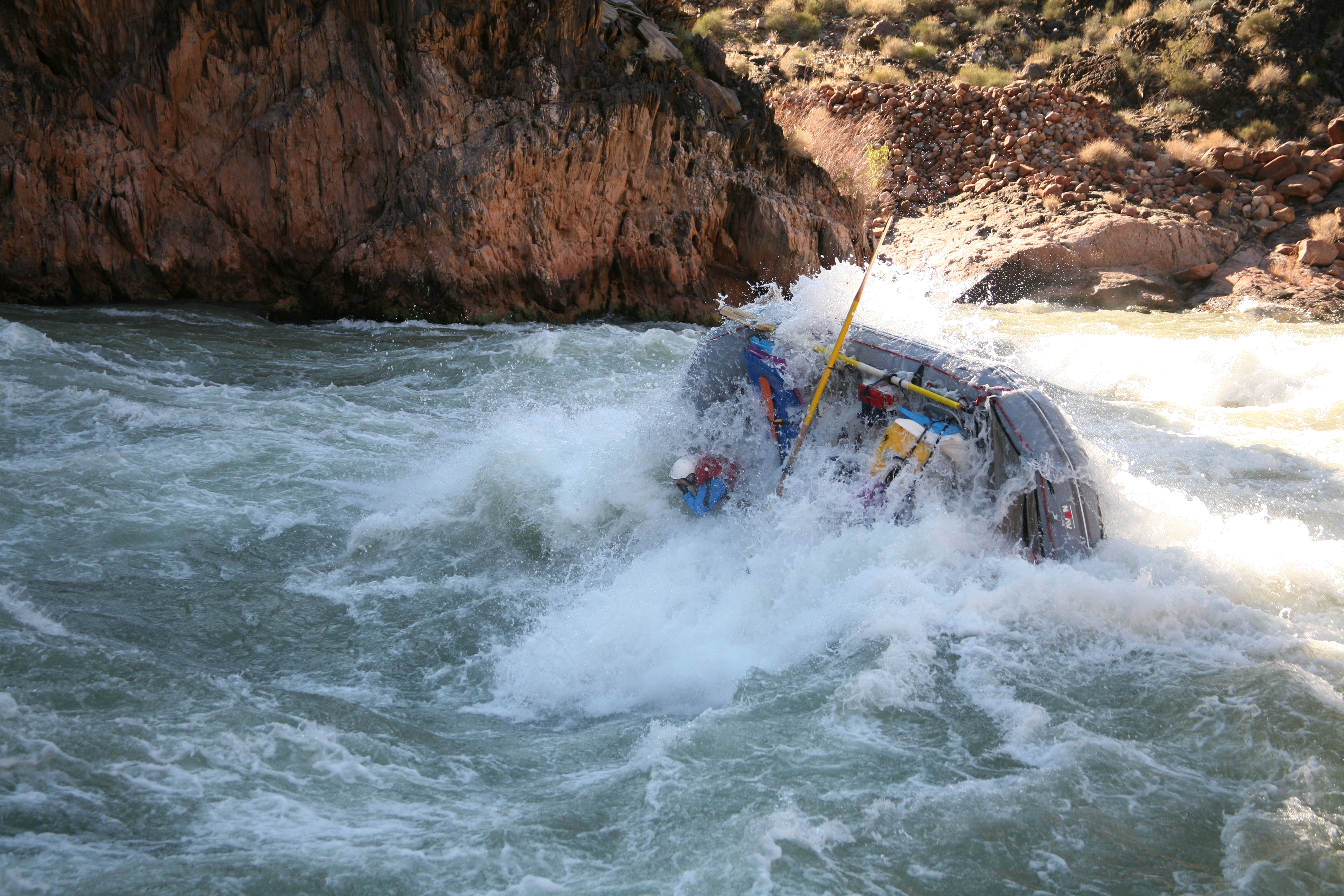 ^ Stylish raft flip - The white helmet at the back of the raft is Karen being dumped unceremoniously into the river after Captain Sideways hit the hole in a full-on broadside fashion. Note that the good captain is not pictured, having abandoned ship at the first sign of trouble.