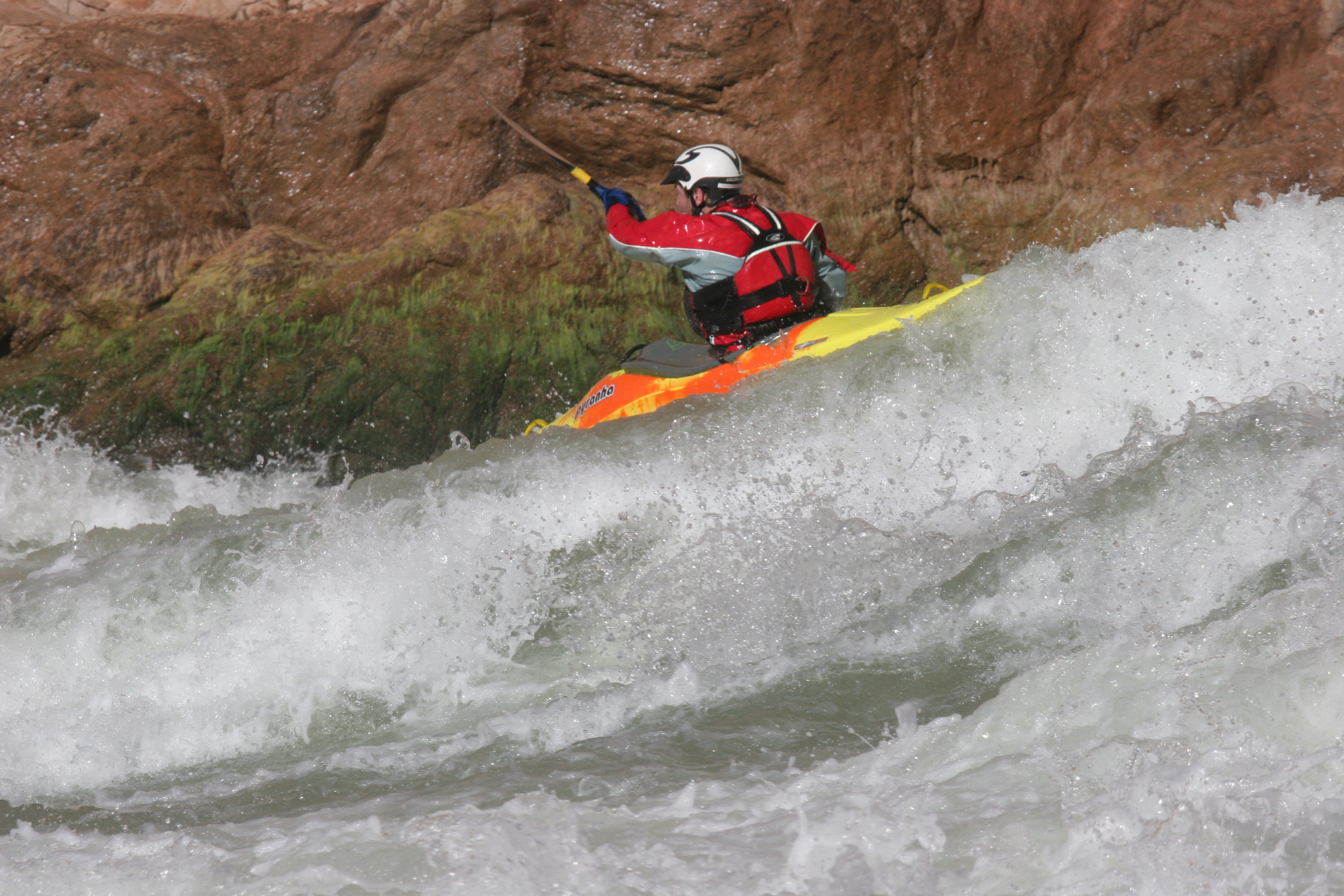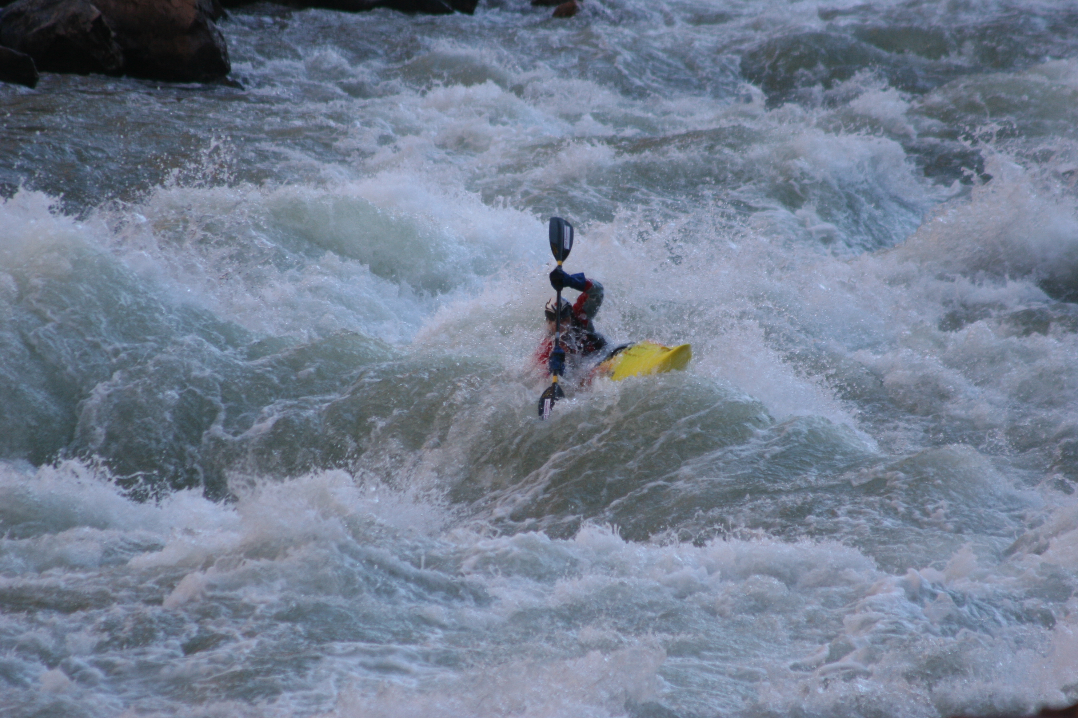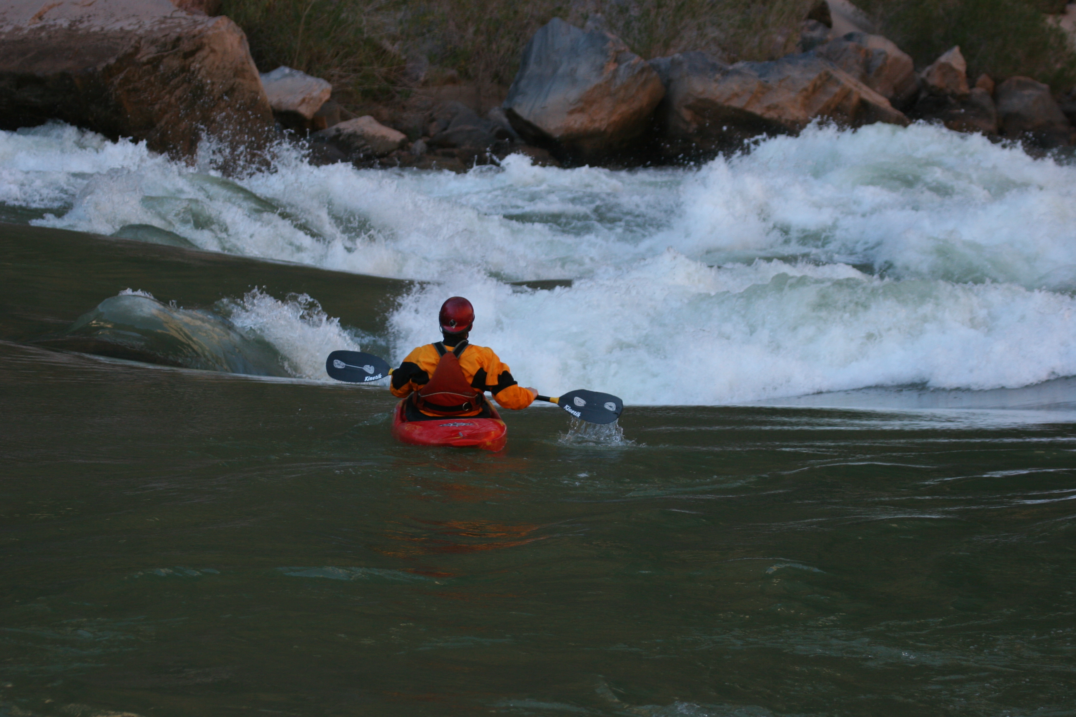 ^ Jim on the lip - Each rapid begins in the same way - a green tongue funneling down into a wavetrain, with each wave being higher and steeper than the previous one. The trick, more so for rafts rather than kayaks, is to pick your starting spot carefully. I plot my course.