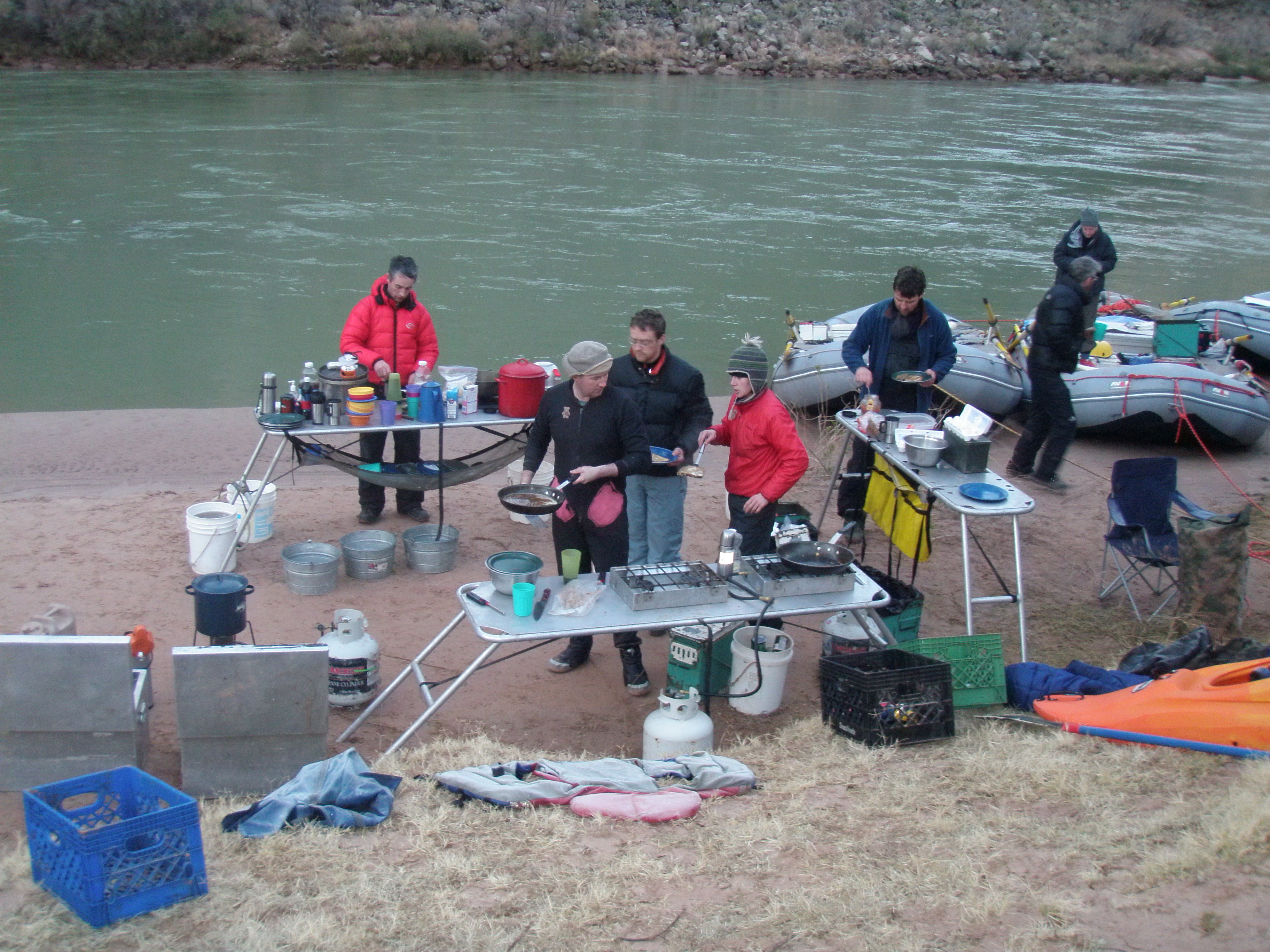 ^ Breakfast - Chef Donnie, in his baby-grow thermals, serves up breakfast, while others begin the process of packing the rafts for the day. A hot breakfast was a vital component of the morning's activities.