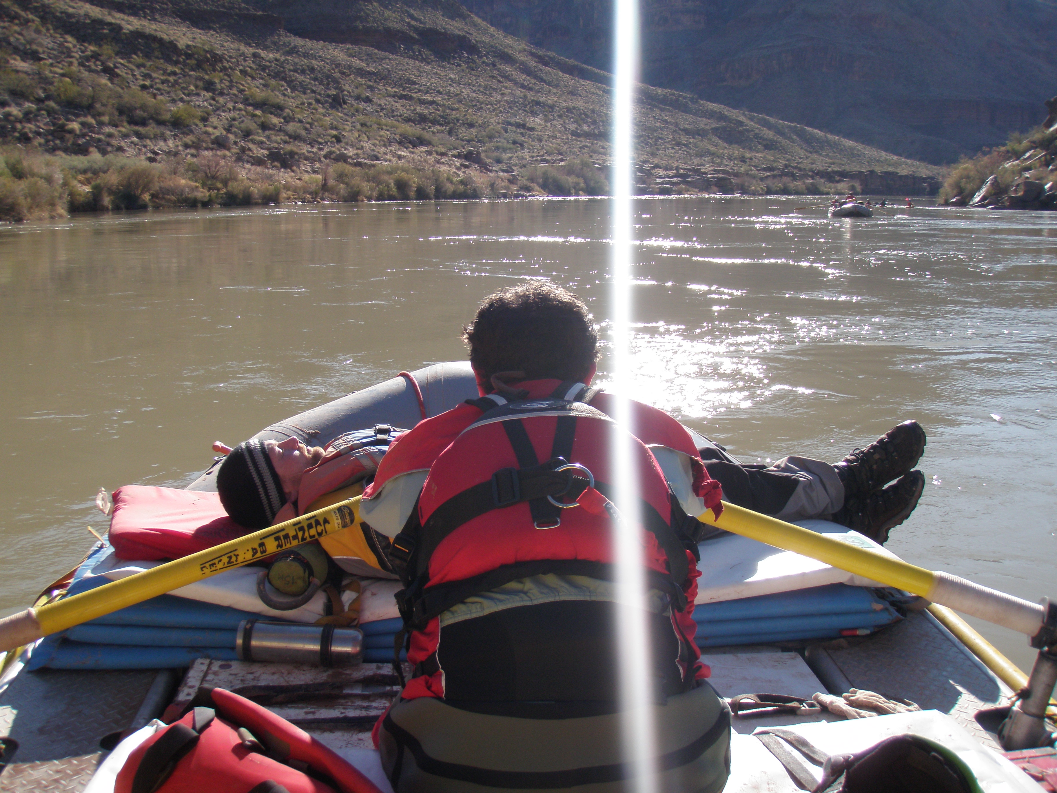 ^ Laden raft - Angie at the prow, Brian mans the oars, and Hugh rummages for biscuits on a laden raft. We had four rafts like this one. This one is packed with sleeping pads, a spare set of oars, a stack of personal drybags behind the seat. Buried underneath all that are tables, chairs, food boxes, a toilet, tents, first aid box, and the kitchen sink.