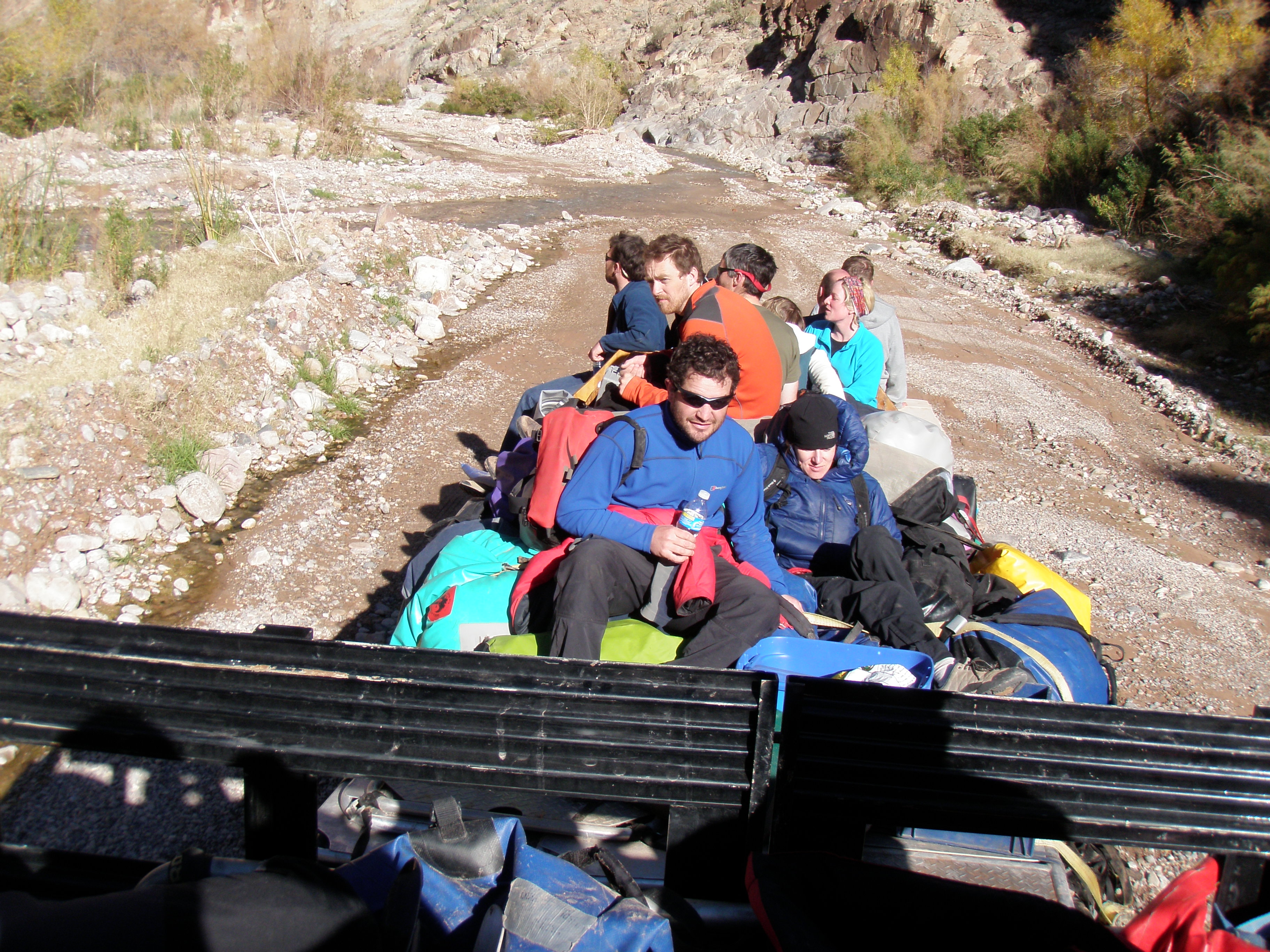 ^ Truck out - A happy but mostly grizzly crew on the back of the truck hauling up out of the canyon at Diamond Creek on the last day. Looking forward to showers, shaves, and comfortable beds.