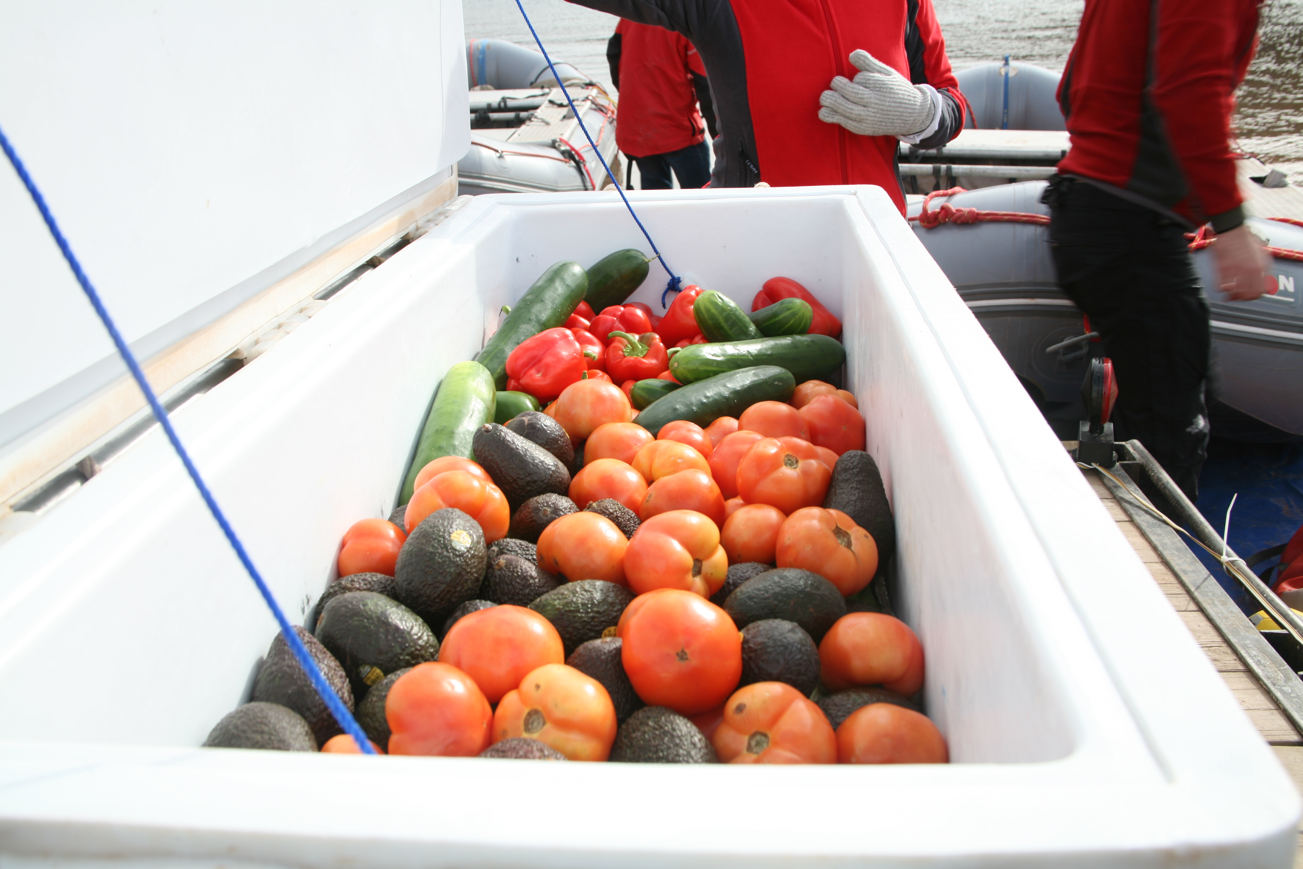 ^ Fruit and vegetables - The oarsman in each raft sat on top of sleeping pads stacked on iceboxes - this one was a store of fresh fruit and veg. The bottom of the icebox sat on the floor of the raft in constant thermal contact with the river. At the end of the trip, there were still slabs of ice underneath them.