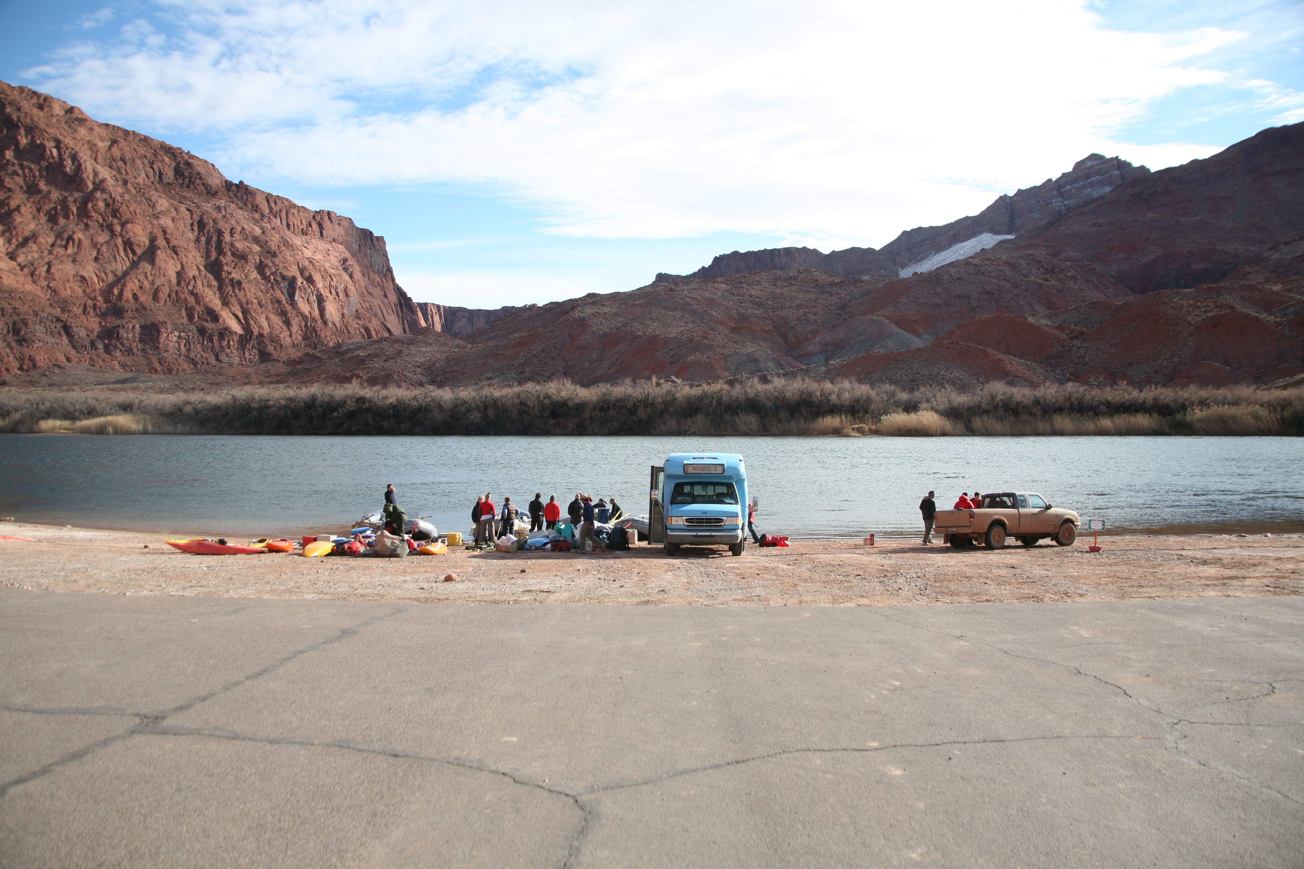 ^ Lee's Ferry - This is the scene at the start point, where the entire contents of the blue bus were loaded on the rafts. Everything for the two week trip is either here or it's not coming. Here the canyon hasn't begun and there is road access, the last road until the end, 225 miles downstream.