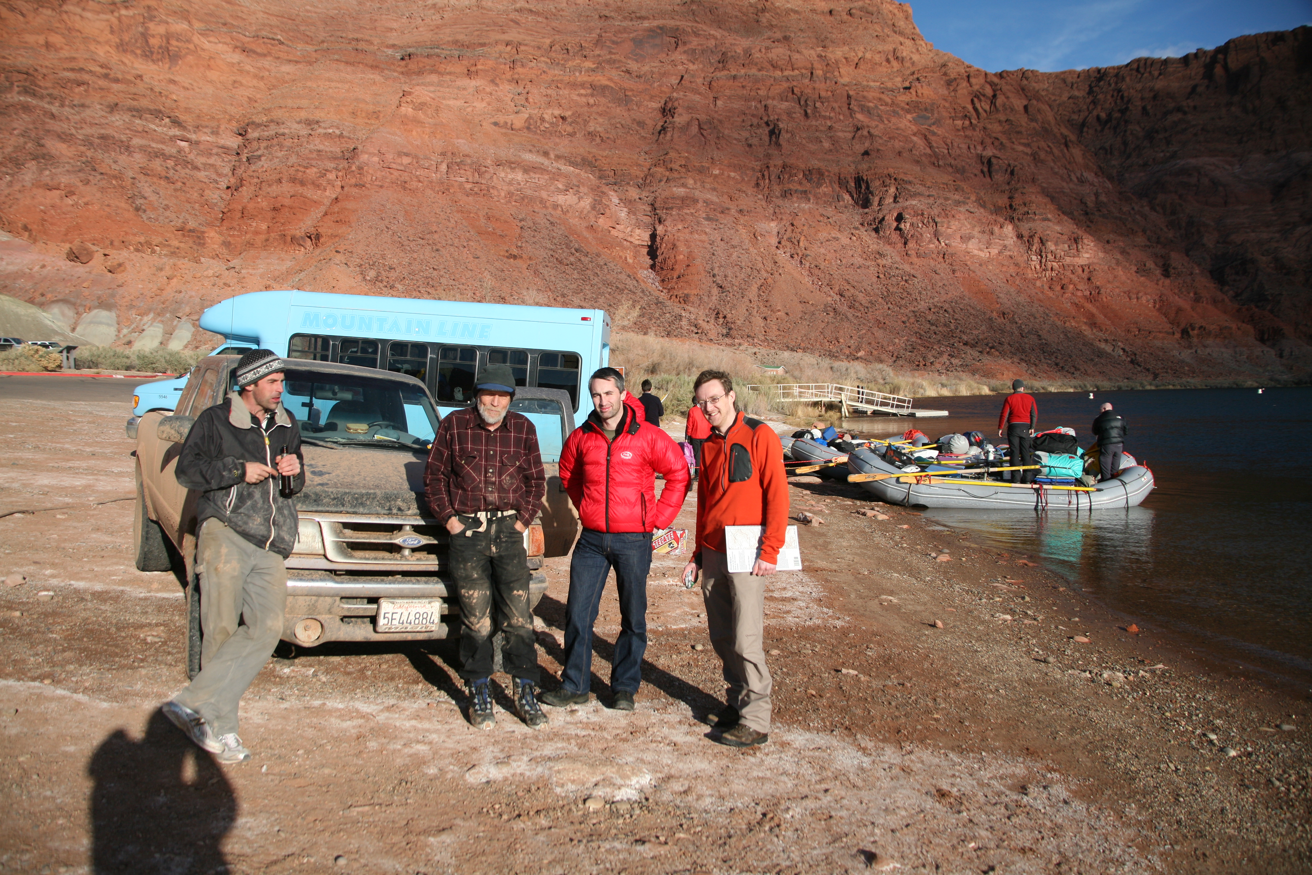 ^ Norbert - The old-timer in the centre is a legend of the Grand Canyon. Between professional raft guiding and personal trips, Norbert has probably been down the canyon more times than anyone. He marked up our guidebook with helpful advice on the best campsites for winter sunshine and where to find firewood. His longest trip was a six-week adventure - as he said himself: "Hey, it was the sixties; none of us had jobs."