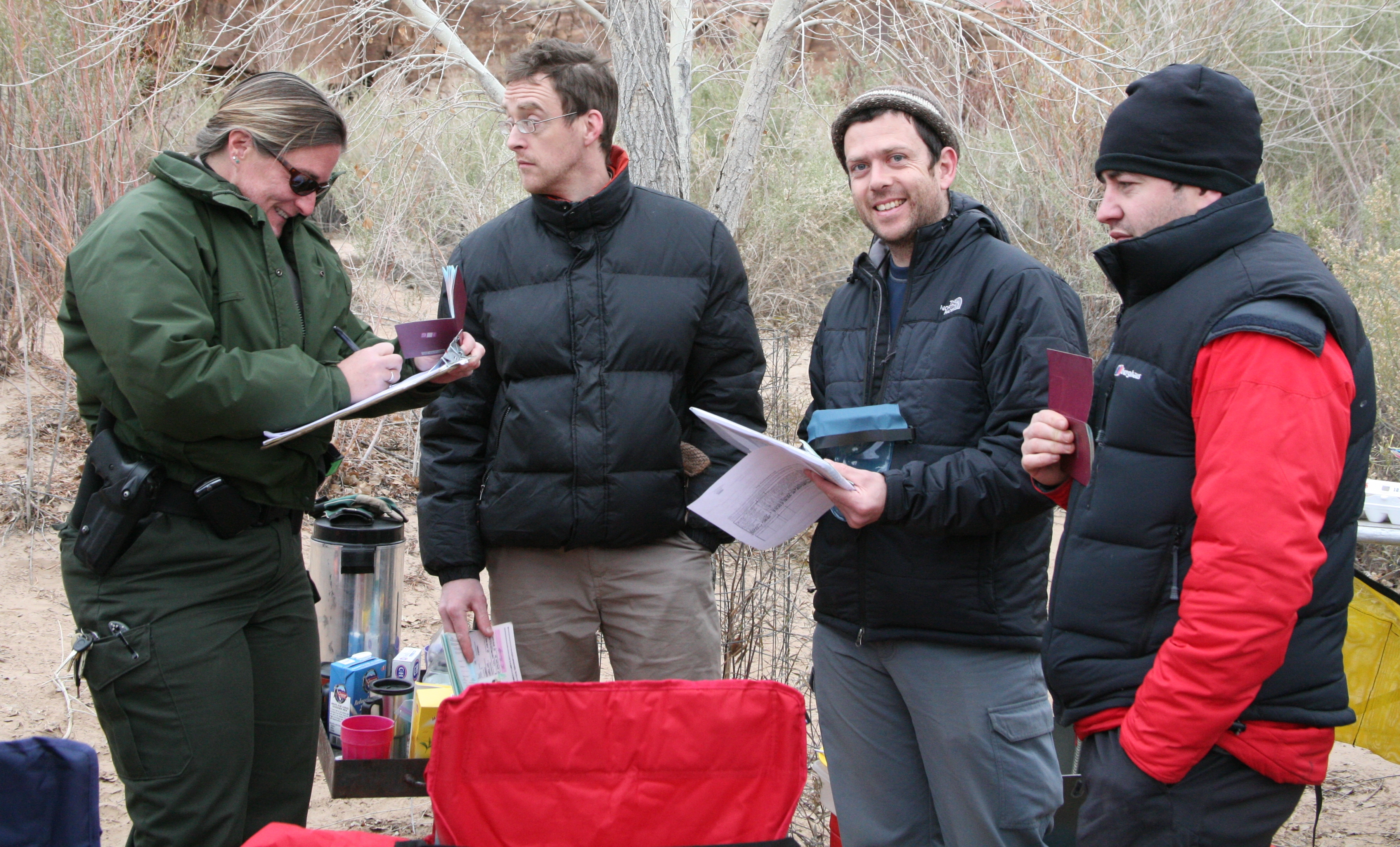 ^ Ranger Peggy - The Park Ranger's checklist included equipment check, cursory contraband search, explanation of the park regulations, as well as passport control, seen here.