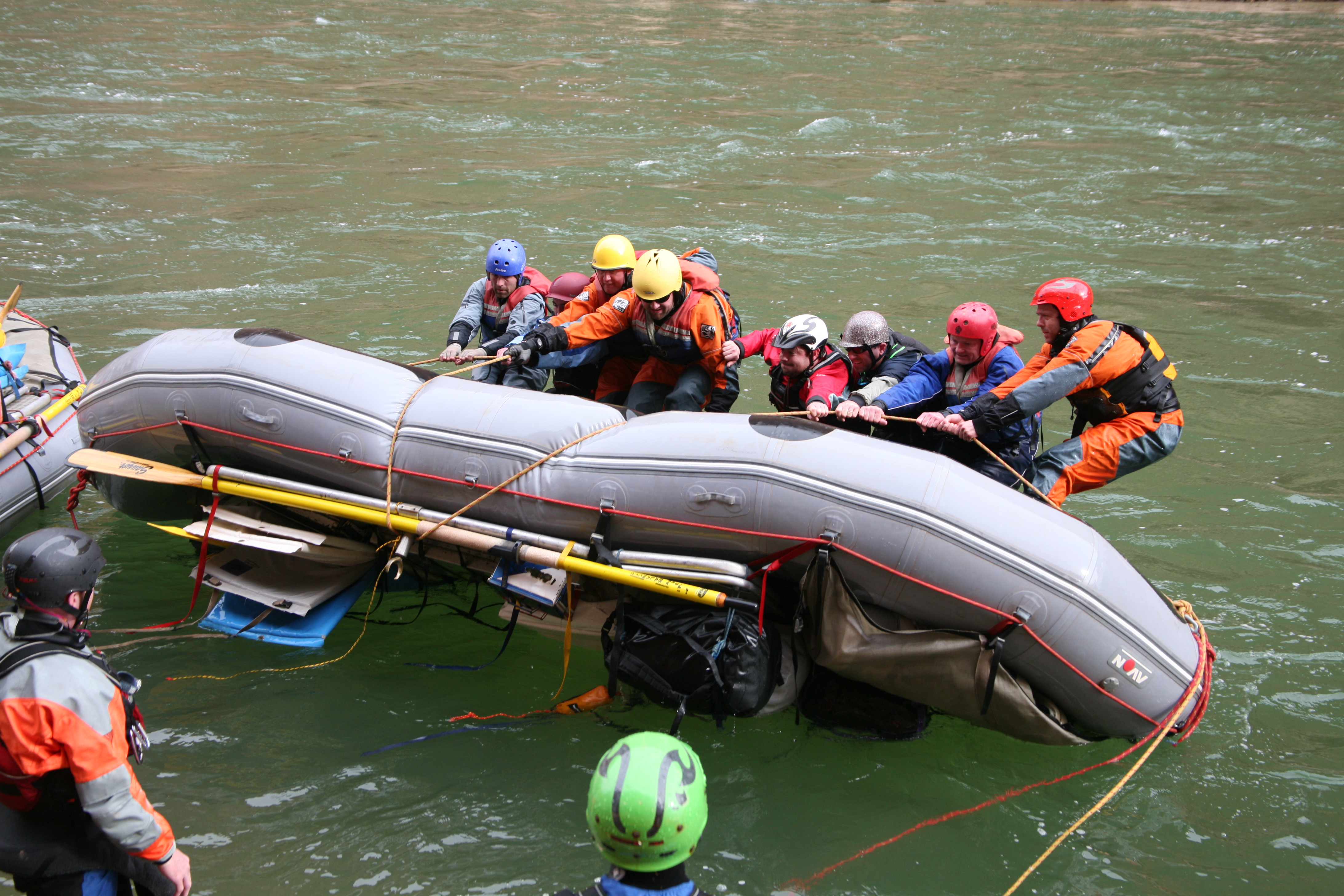 ^ Raft flip - When Captain Sideways flips a raft, he flips it good. It took eight men to right this fully laden raft. Karen has still not completely forgiven Donnie for the quarter-mile swim she took as a result of his helmsmanship.
