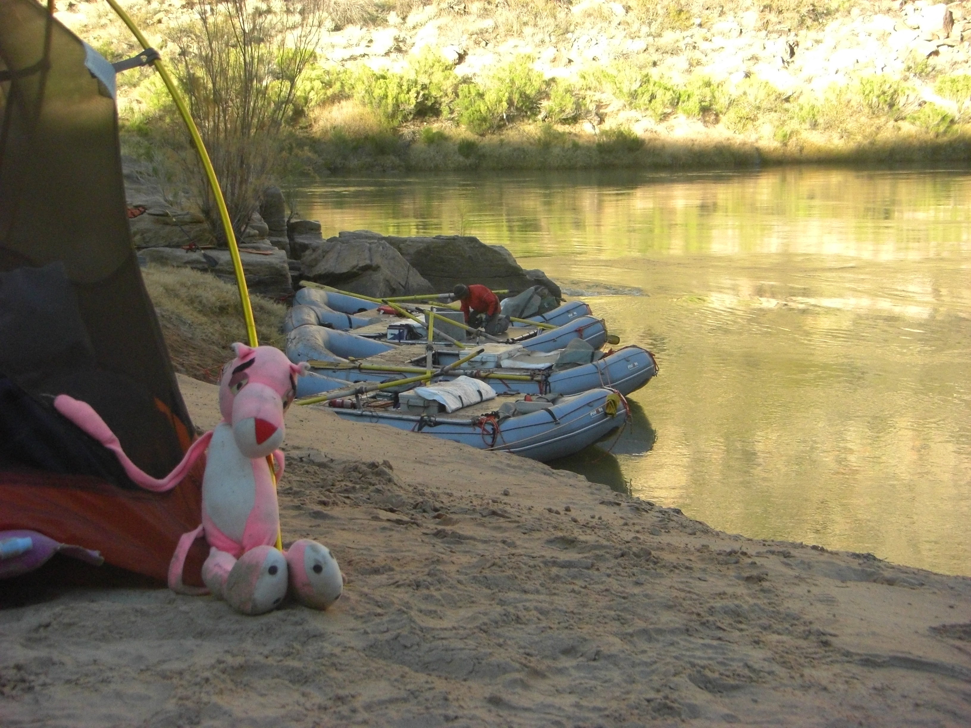 ^ Campsite - A typical campsite with gear hanging up to dry and tents pitched all around. Most of the campsites are beaches created by fast-flowing side rivers dumping their sediment on joining the slower Colorado river.