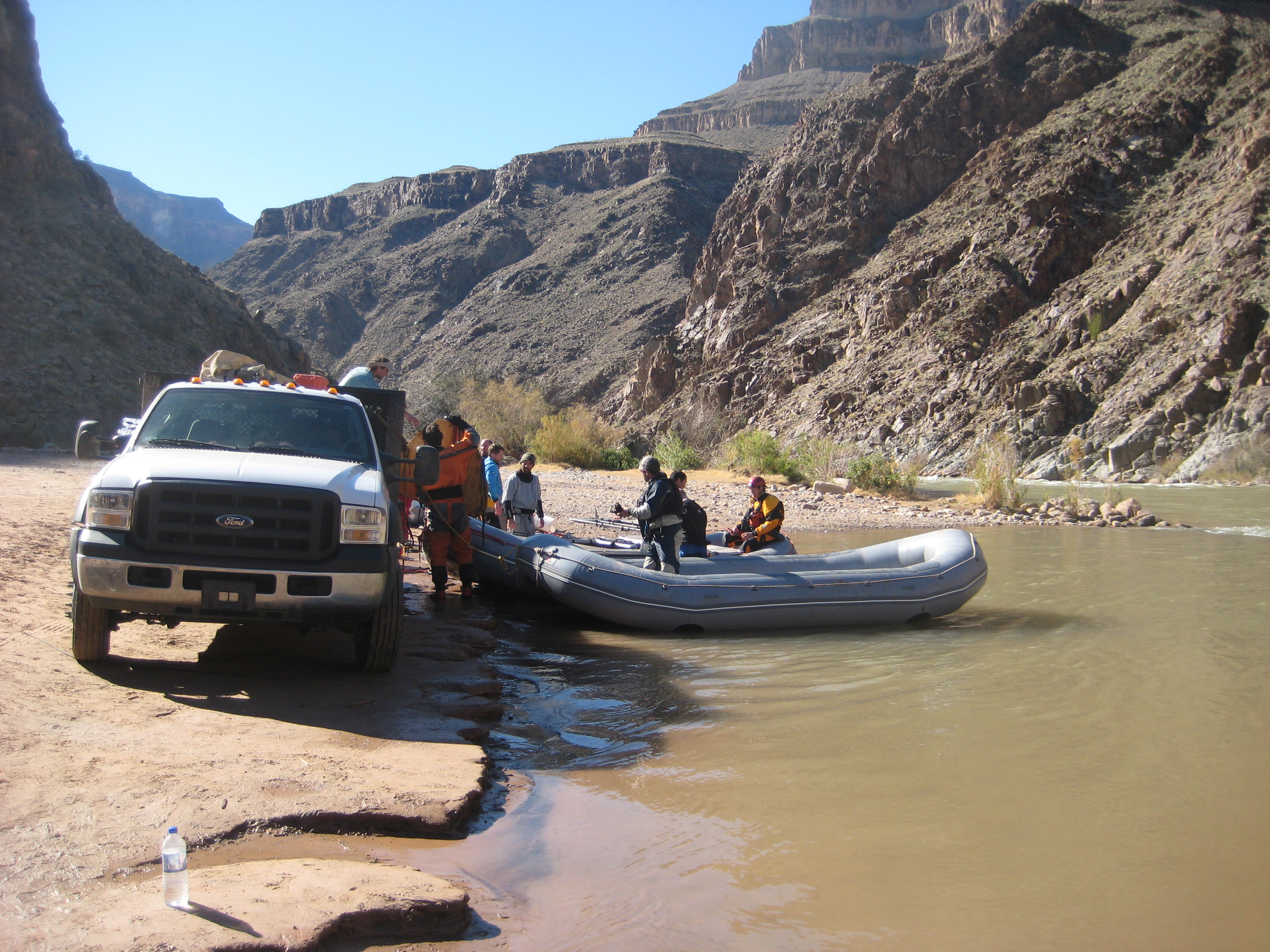 ^ Diamond Creek - At the take-out, the last raft gets dismantled and loaded onto the truck for the steep climb out through the Indian reservation and back to Flagstaff.